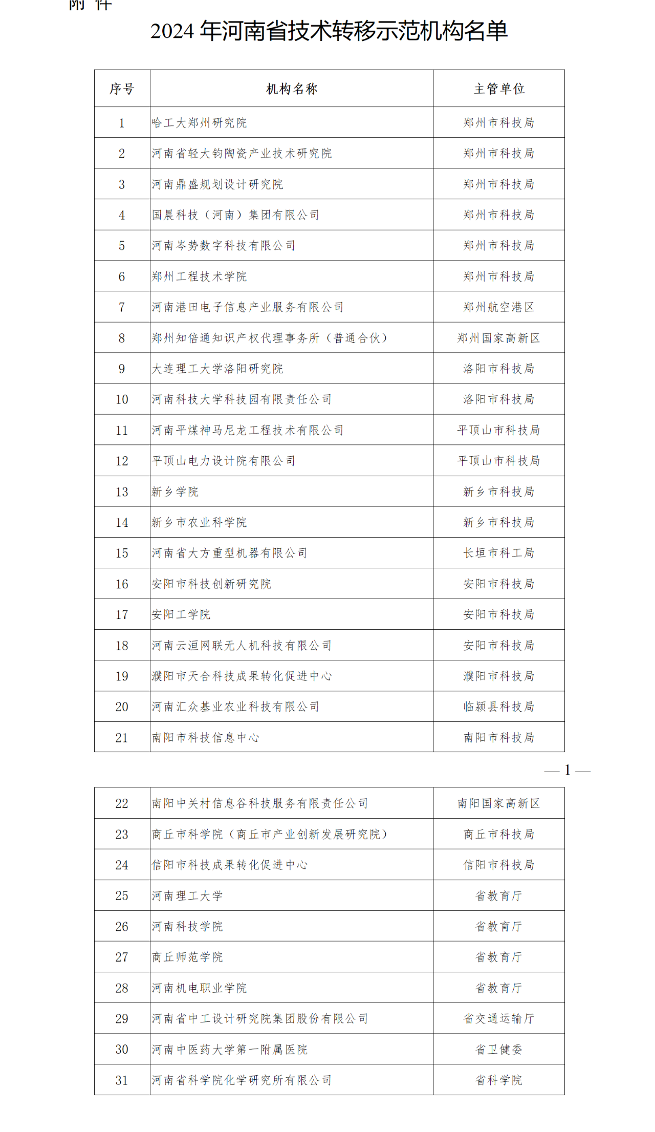 为推动技术转移示范机构健康发展,加快技术成果转移转化,促进技术市场繁荣发展,根据《河南省技术转移体系建设实施方案》(豫政〔2019〕8号)有关精神及《关于组织开展2024年河南省技术转移示范机构申报工作的通知》(豫科〔2024〕74号)要求,经主管单位初审推荐、专家论证、厅长办公会研究等程序,确定哈工大郑州研究院等31家单位为省级技术转移示范机构。