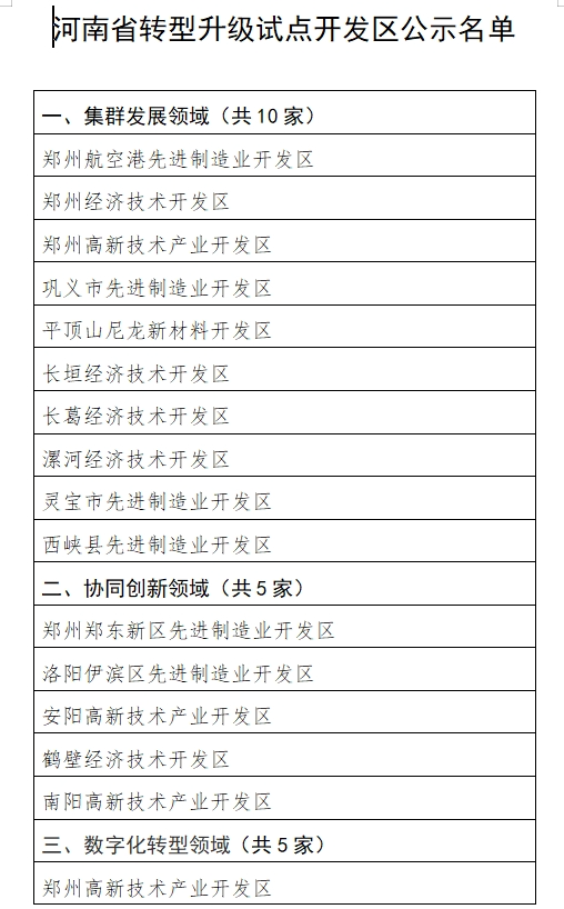 按照《河南省人民政府办公厅关于印发河南省转型升级试点开发区培育办法的通知》(豫政办〔2024〕49号)要求,我委开展了转型升级试点开发区遴选工作,经开发区自愿申报、省辖市推荐、第三方评审以及征求有关省直部门意见,确定了培育名单,现予以公示,请社会各界监督。公示期为2024年11月27日至2024年12月4日(五个工作日)。如有异议,请在公示期内以书面形式将意见反馈至省发展改革委工业发展处。