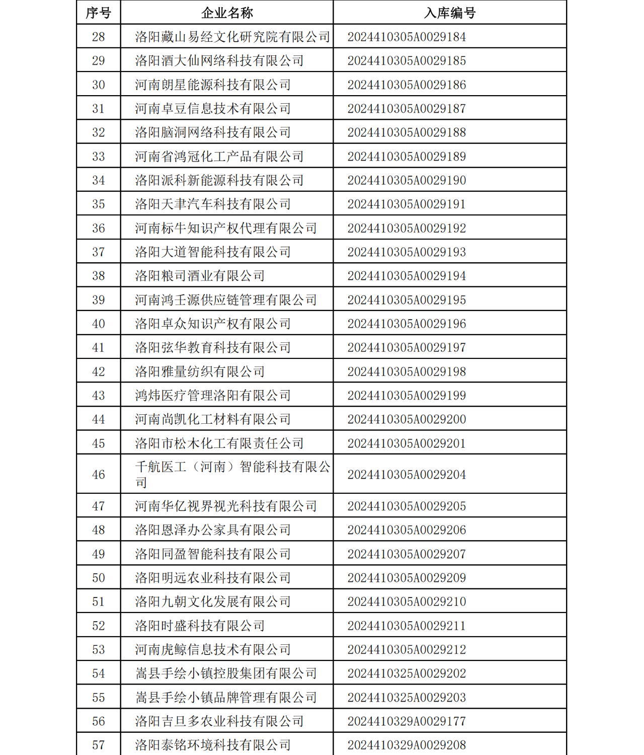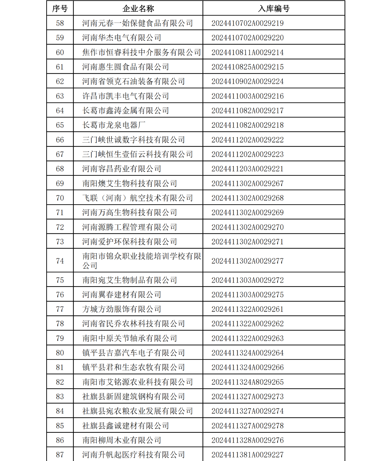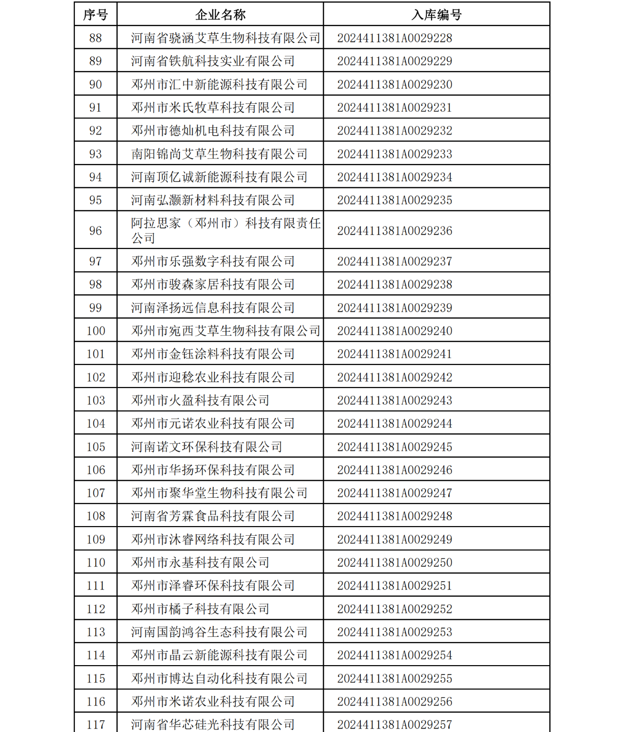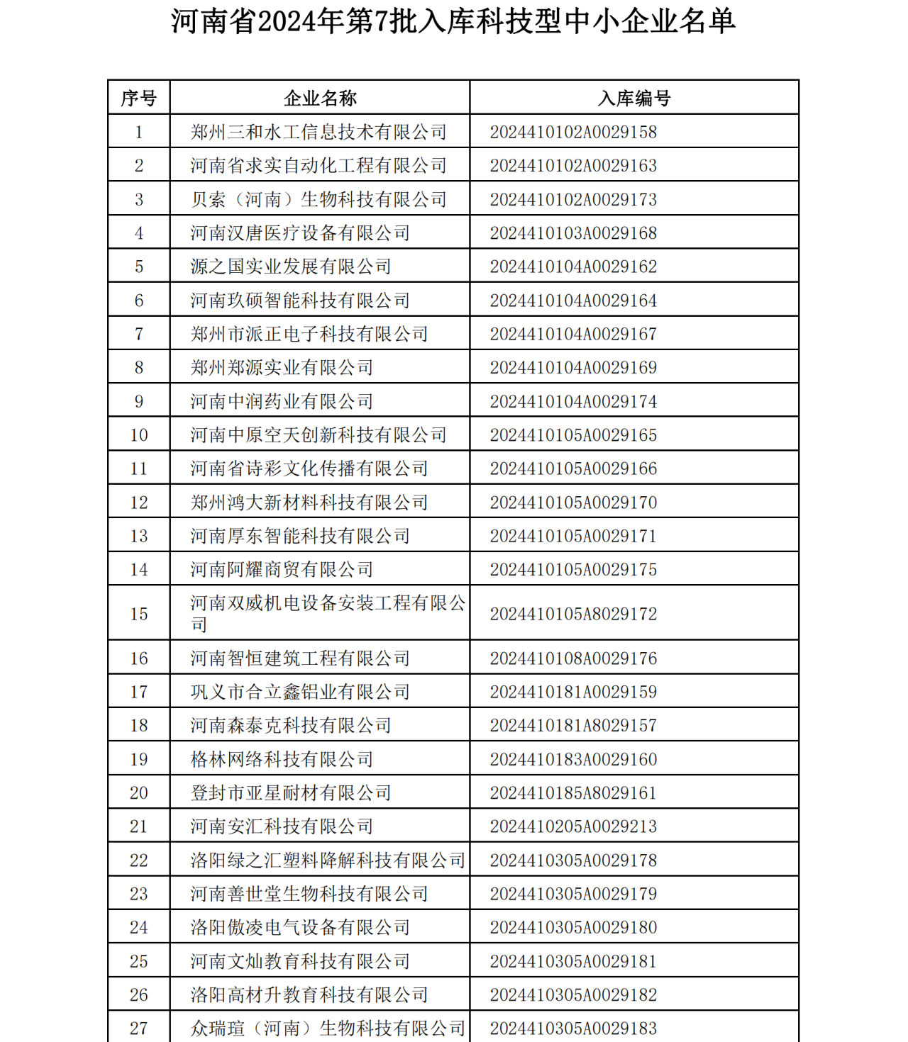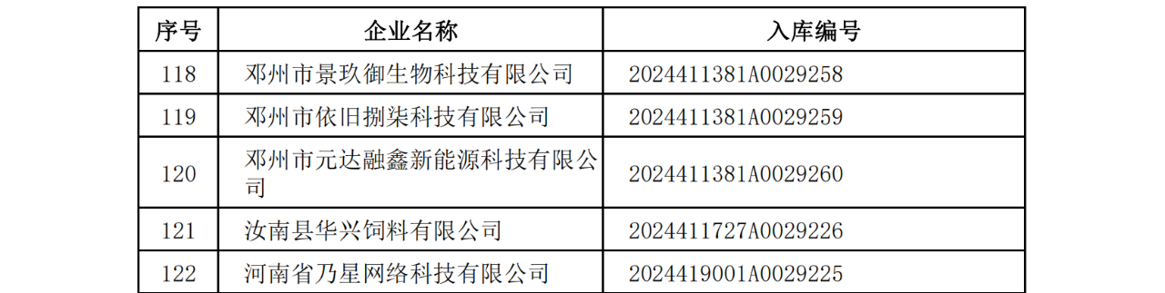 公示期间经异议核实处理等工作,共有3家企业不符合科技型中小企业条件。最终,共有郑州三和水工信息技术有限公司等122家企业获得科技型中小企业入库编号,现将通过公示的河南省2024年第七批122家入库企业名单(详见附件)予以公告。