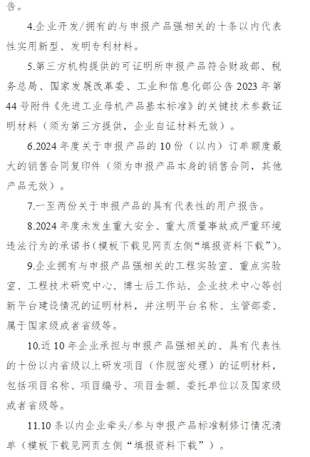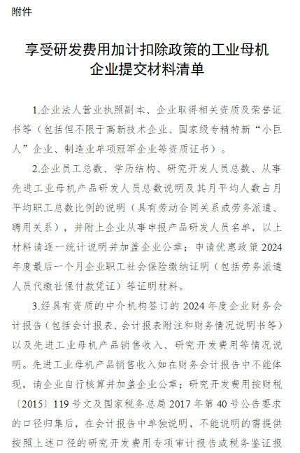 关于2024年度享受研发费用加计扣除政策的工业母机企业清单制定工作有关事项的通知各省、自治区、直辖市及计划单列市、新疆生产建设兵团工业和信息化主管部门、发展改革主管部门、财政厅(局),国家税务总局各省、自治区、直辖市、计划单列市税务局:根据《财政部 税务总局 国家发展改革委 工业和信息化部关于提高集成电路和工业母机企业研发费用加计扣除比例的公告》(财政部 税务总局 国家发展改革委 工业和信息化部公告2023年第44号)有关规定,为做好2024年度享受研发费用加计扣除政策的工业母机企业清单制定工作,现就相关事项通知如下:一、适用本通知规定加计扣除政策的工业母机企业需同时符合以下条件:(一)生产销售先进工业母机主机、关键功能部件、数控系统(以下称先进工业母机产品,详见财政部、税务总局、国家发展改革委、工业和信息化部公告2023年第44号的附件《先进工业母机产品基本标准》)的工业母机企业;(二)2024年度申请优惠政策的企业具有劳动合同关系或劳务派遣、聘用关系的先进工业母机产品研究开发人员月平均人数占企业月平均职工总数的比例不低于15%;(三)2024年度申请优惠政策的企业研究开发费用总额占企业销售(营业)收入(主营业务收入与其他业务收入之和,下同)总额的比例不低于5%;(四)2024年度申请优惠政策的企业生产销售本通知规定的先进工业母机产品收入占企业销售(营业)收入总额的比例不低于60%,且企业收入总额不低于3000万元(含)。二、申请列入清单的企业应于2025年3月31日前登录系统。(www.gymjtax.com),选择“工业母机企业研发费用加计扣除政策申报入口”提交申请,并生成纸质文件加盖企业公章,连同必要佐证材料(电子版、纸质版)报各省、自治区、直辖市及计划单列市、新疆生产建设兵团工业和信息化主管部门(以下称地方工信部门)。已列入2023年清单的企业,拟继续申请进入2024年清单的,须重新提交《享受研发费用加计扣除政策的工业母机企业提交材料清单》(见附件)中第2、3、6、8项,其余项若有变化请一并提交。三、地方工信部门根据企业条件(见本通知第一条)登录系统(www.gymjtax.com:8888/)对企业申报信息进行初核,并于4月15日前将初核通过名单报送至工业和信息化部。对于初核不通过企业,在系统内备注不通过理由。四、工业和信息化部组织第三方机构,根据企业申报信息开展资格复核。根据复核意见,综合考虑工业母机产业链重点领域企业情况,工业和信息化部、国家发展改革委、财政部、税务总局进行联审并确认最终清单。企业可于5月10日后,从信息填报系统中查询是否列入清单。五、列入清单的企业在下一年度企业所得税预缴申报时,可自行判断是否符合条件,如符合条件,在预缴申报时可先行享受优惠。年度汇算清缴时,如未被列入2025年度清单,按规定补缴税款,依法不加收滞纳金。六、地方工信部门会同发展改革、财政、税务部门按职责分工对清单内企业加强日常监管。在监管过程中,如发现企业存在以虚假信息获得减免税资格,应及时联合核查,并联合报送工业和信息化部进行复核。工业和信息化部会同国家发展改革委、财政部、税务总局复核,对确不符合条件的企业,取消其享受政策资格,并在三年之内不得申请享受本优惠政策。七、企业对所提供材料和数据的真实性负责申报企业应签署承诺书,承诺申报出现失信行为,接受有关部门按照法律法规和国家有关规定处理。享受研发费用加计扣除政策的工业母机企业提交材料清单