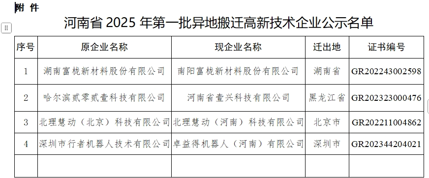 根据《高新技术企业认定管理办法》(国科发火〔2016〕32 号)和《高新技术企业认定管理工作指引》(国科发火〔2016〕 195号)关于高新技术企业异地搬迁的有关规定,经企业申请,地方初审,以及省高新技术企业认定管理工作领导小组会商等程序,湖南富栊新材料股份有限公司等4家企业异地搬迁后仍符合高新技术企业认定条件。现对该批异地搬迁的高新技术企业(见附件)予以公示,公示期为10个工作日。