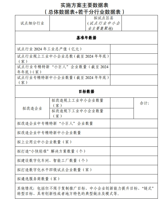 申报试点城市的省(区、市),由省级财政部门联合同级中小企业主管部门择优选定拟申报的试点城市,并向财政部、工业和信息化部报送推荐函。 广东、江苏、浙江、山东、河南、安徽、福建、湖南、湖北、江西、四川、河北等12个省份,本次试点可最多推荐2个城市,其他省(区、市)最多推荐1个城市。 报送时间:2025年5月20日前 一、总体要求 坚持以习近平新时代中国特色社会主义思想为指导,全面贯彻党的二十大和二十届二中、三中全会精神,按照中央经济工作会议部署,落实政府工作报告有关要求,深入实施《中小企业数字化赋能专项行动方案(2025-2027年)》(工信部联企业〔2024〕239号),扎实开展中小企业数字化转型城市试点工作,充分发挥企业创新主体作用,推动发展新质生产力,加快推进新型工业化。 二、重点任务 (一)围绕企业需求,突出转型实效。精准把握中小企业数字化转型实际需求,剖析“不愿转、不敢转、不会转”深层次原因,靶向施策推动中小企业围绕研发、生产等关键环节开展深度改造。要把中小企业数字化转型作为助企纾困和提升竞争力的关键举措,助力企业在创新、市场、提质、降本、增效、绿色、安全等方面实现价值提升,切实增强企业获得感与竞争力。 三、支持对象 2025年将选择34个左右的城市开展第三批试点工作,试点城市应为地级市及以上,包括各省(区)的省会城市、其他地级市,直辖市所辖区县。已纳入前两批试点范围的城市不得重复申报。第三批城市试点实施期两年,自实施方案批复之日起开始计算。 四、工作要求 (一)聚焦重点行业 试点城市应坚持推动传统产业改造升级和促进战略新兴产业、未来产业发展并重,在计算机和通信电子设备制造、通用和专用设备制造、汽车制造等制造业重点行业中选择具体细分领域开展数字化转型试点,选取的细分行业应符合国家区域战略发展规划和产业导向,体现自身产业基础和特色优势,具有产值规模较大、中小企业集聚度较高、改造潜力较深、改造后效益提升明显的特征,避免分散。要结合不同行业特点,深入梳理行业共性改造需求,分业分级推进试点企业的数字化改造。 (二)聚焦重点企业 试点城市要在确定的细分行业中,选择处于产业链关键环节的中小企业作为本次数字化改造的重点对象,要优先将专精特新中小企业和规模以上(以下简称规上)工业中小企业纳入改造范围。重点推动企业开展生产过程、产品生命周期和产业链供应链等关键业务环节的深度数字化改造,推进数据采集、场景集成和系统互联互通。因地制宜推进人工智能大模型、大数据、区块链等技术在研发设计、视觉质检、参数优化、能耗管理、智能分拣等场景中的应用。各地区试点城市被改造企业数量及改造后应达到的数字化水平按照《通知》执行。 (三)扩大复制推广 试点城市要选择若干基础条件好、转型效果突出、投入产出比高、可复制性强的试点企业作为转型样板,引导同行业企业“看样学样”。要促进服务商聚焦细分行业领域专精特新发展,打造一批高度适配细分行业中小企业转型需求的“小快轻准”数字化技术产品和解决方案,总结面向细分行业的专业化转型路径,加强宣传推广。实施期满时要实现专精特新中小企业和细分行业规上工业中小企业“应改尽改”(每个细分行业省级专精特新中小企业和规上工业中小企业数字化水平二级及以上比例应达到90%以上,国家级专精特新“小巨人”企业数字化水平均应达到二级及以上);规模以下(以下简称规下)工业中小企业“愿改尽改”(规下工业中小企业数字化水平二级及以上的比例应实现明显提升)。试点城市对试点企业、服务商的遴选管理要做到对各类所有制一视同仁、公平竞争、充分开放。 五、组织申报 申报试点城市的省(区、市),由省级财政部门联合同级中小企业主管部门择优选定拟申报的试点城市,并向财政部、工业和信息化部(以下统称两部门)报送推荐函。 为进一步支持经济大省挑大梁,更好发挥其带动和支柱作用,加强对中小企业数字化转型的支持力度,截至2024年底,根据国家统计局数据规上工业中小企业数量超过15000家的省份(包括广东、江苏、浙江、山东、河南、安徽、福建、湖南、湖北、江西、四川、河北等12个省份),本次试点可最多推荐2个城市,推荐排名不分先后。其他省(区、市)最多推荐1个城市。 省级财政部门及同级中小企业主管部门需做好试点城市的组织和推荐工作,对于拟申报试点的城市应按要求编制中小企业数字化转型城市试点实施方案,需包括城市现有工作基础、工作目标、具体实施内容、资金使用方向、保障措施、责任分工等内容。实施方案应充分总结分析前两批试点城市的实践经验和问题,明确如何在本次工作中继承有效做法、持续优化举措,提高方案的针对性和可行性。同时,已纳入前两批试点范围的城市需对照两部门批复的实施方案报送工作进展情况,并将作为第三批试点城市遴选参考。 上述资料由省级财政部门联合同级中小企业主管部门将加盖公章的纸质版和PDF版(光盘刻录)及推荐函各一式两份,于2025年5月20日前报送两部门。 资金分配和使用、绩效管理、组织实施等相关工作将按照《通知》要求执行。各试点城市需加强对中央财政资金的使用管理,坚决杜绝将已改造完成项目包装成试点期间新项