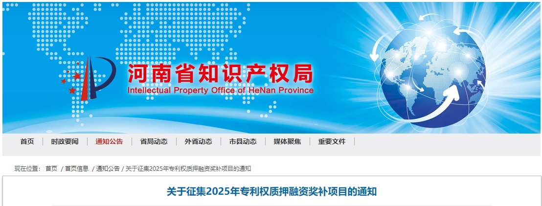 为加快专利转化专项计划实施,推进知识产权质押融资入园惠企专项行动,根据《河南省专利权质押融资奖补项目管理办法》(豫知〔2017〕63 号),省局决定征集 2025 年专利权质押融资奖补项目,具体事项通知如下。