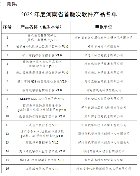 根据《河南省工业和信息化厅 河南省财政厅关于开展2025年度河南省首版次软件产品申报工作的通知》(豫工信联信软〔2025〕82号)工作部署,经企业自愿申报、各地审核推荐、专家评审,拟认定“林长制智慧管理平台[简称:智慧林长]V1.0”等16项软件产品为2025年度河南省首版次软件产品(详见附件),现予以公示,欢迎社会各界监督。如有异议,请于公示期内,以书面材料向省工业和信息化厅反馈。