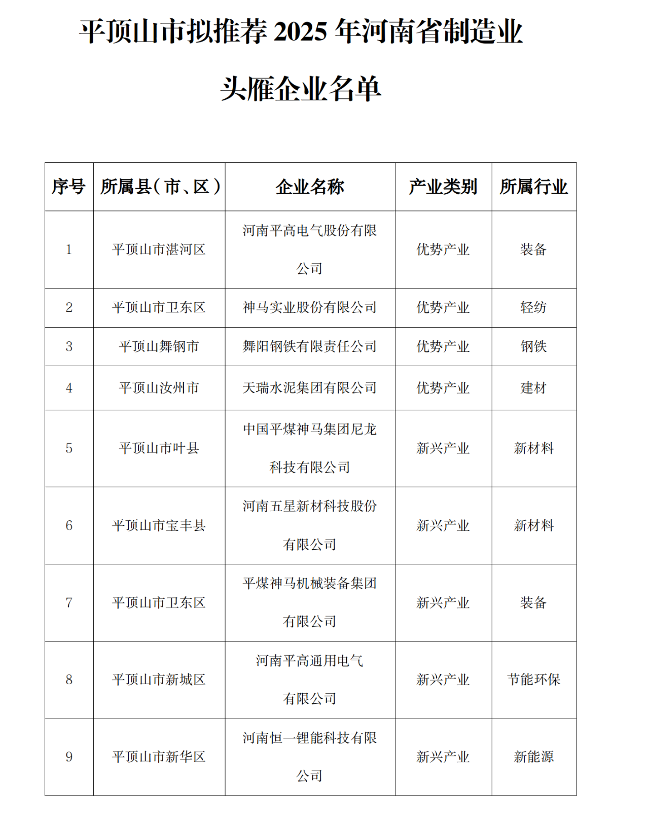 附件:平顶山市拟推荐2025年河南省制造业头雁企业名单