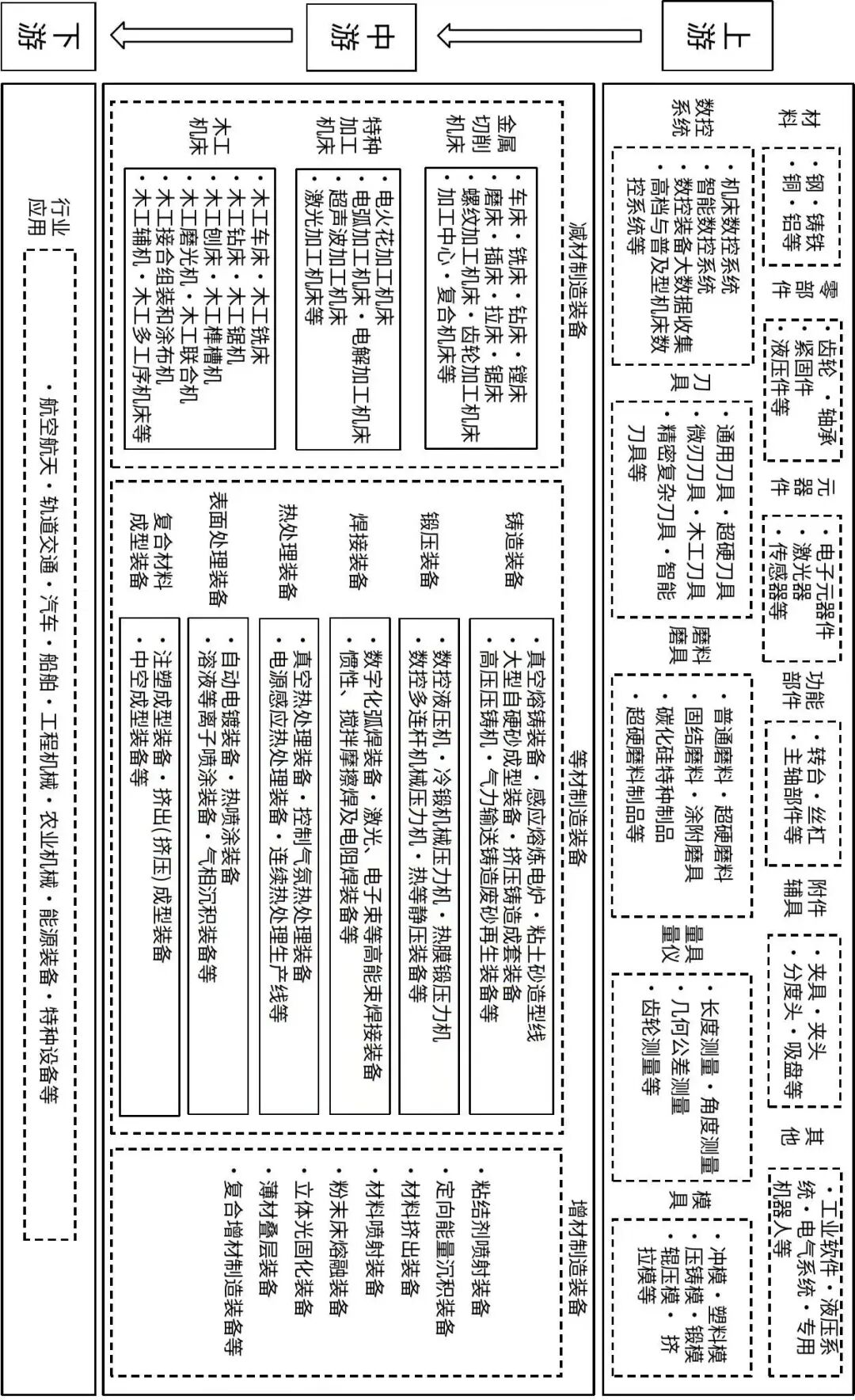 工业母机高质量标准体系基于产业链与标准的映射关系形成。工业母机产业链指以减材制造装备、等材制造装备、增材制造装备为核心,从原材料到终端产品制造及应用的各环节完整链条,产业链上游涵盖配套材料、零部件、功能部件等其他配套产品,下游涵盖航空航天、轨道交通等应用领域。工业母机产业链如图1所示。