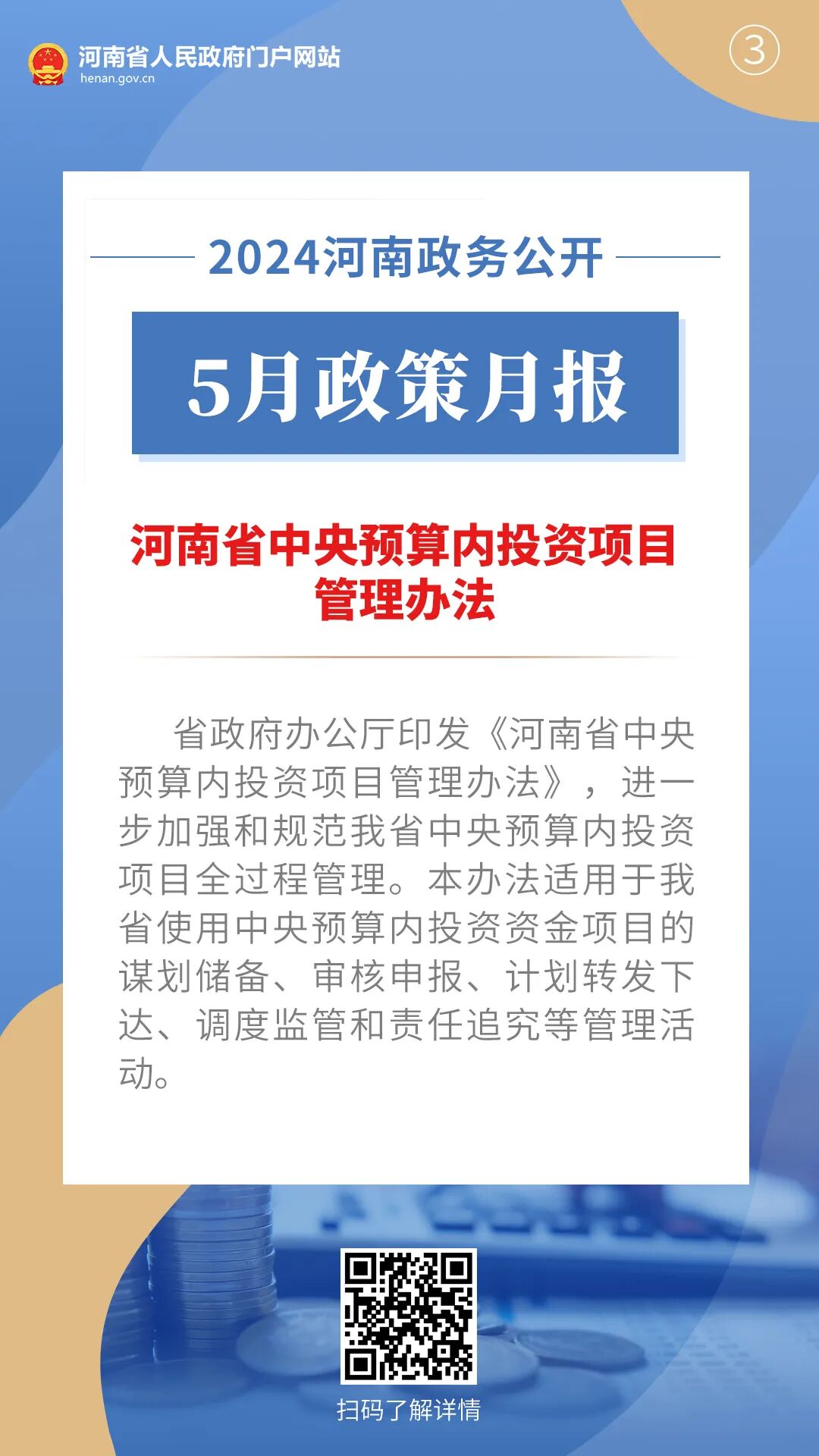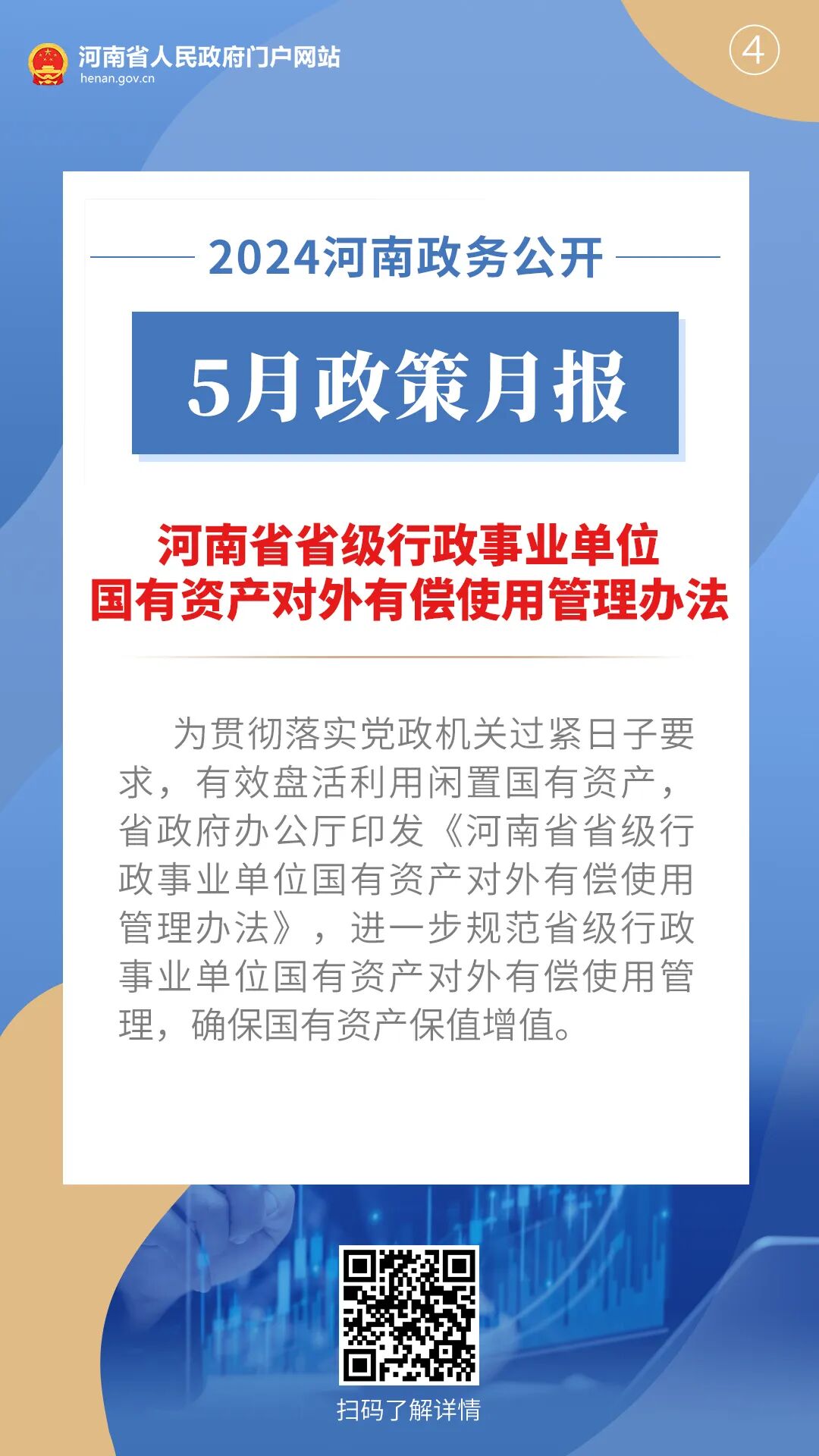 2024年5月,河南省人民政府出台多项重要政策,包括关于做好2024年稳就业工作的通知、2024年河南省便民利企微改革事项、河南省中央预算内投资项目管理办法、河南省省级行政事业单位国有资产对外有偿使用管理办法。通过河南政务公开5月政策月报,一起来看详情——