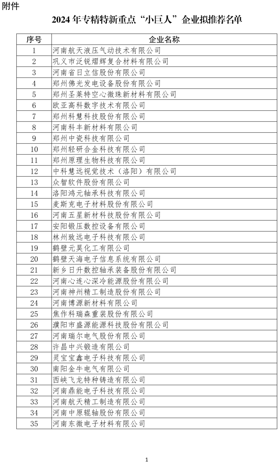 根据《河南省工业和信息化厅 河南省财政厅关于组织开展2024年重点支持专精特新“小巨人”企业遴选推荐工作的通知》(豫工信联企业〔2024〕146号),经企业自愿申报,各省辖市、济源示范区、航空港区工业和信息化主管部门、财政主管部门联合推荐,省工业和信息化厅、财政厅组织专家评审,现将拟向工业和信息化部、财政部推荐的企业名单予以公示。欢迎社会各界参与监督,如有异议,请在公示期内将意见以书面形式反馈至省工业和信息化厅。