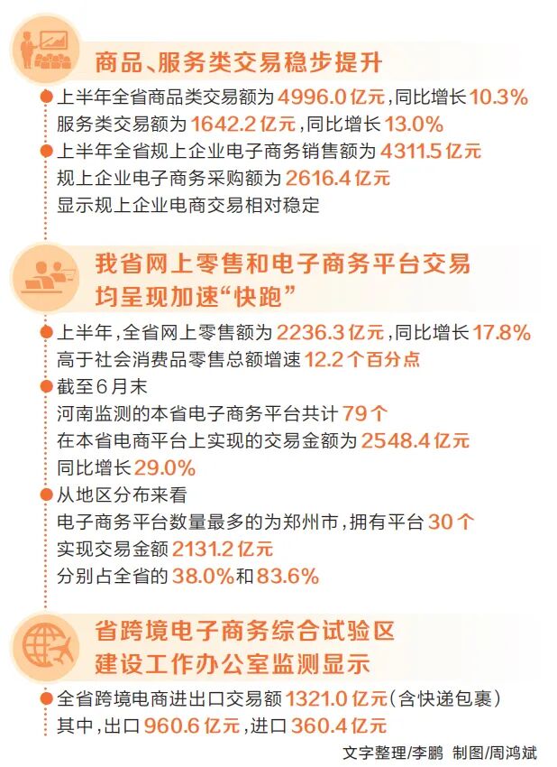 8月13日,记者从省统计局获悉,国家统计局电子商务交易平台统计数据显示:今年上半年,我省商品、服务类电子商务交易额为6638.3亿元,居全国第十位,较上年同期增长10.9%。总体来看,全省电子商务规模实现稳定增长,其中网上零售和电商平台交易表现十分亮眼。