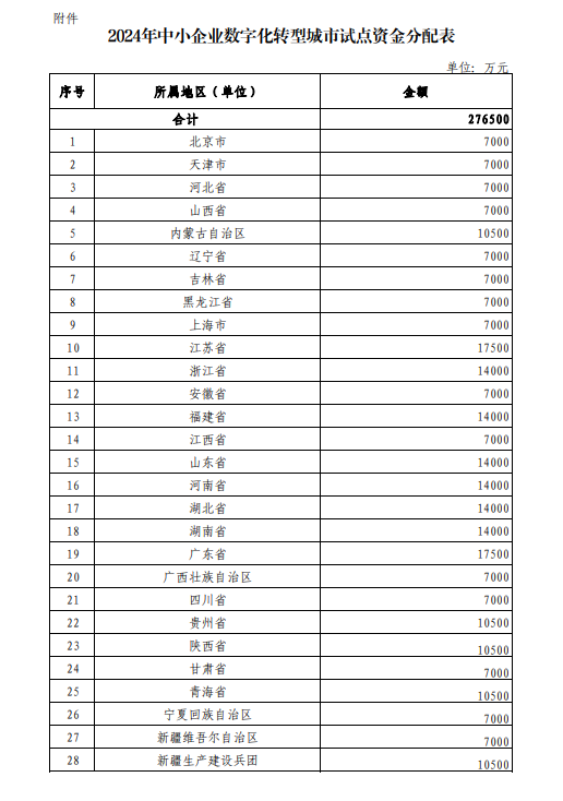 根据《中小企业发展专项资金管理办法》(财建〔2021〕148号)、《财政部办公厅 工业和信息化部办公厅关于做好2024年中小企业数字化转型城市试点工作的通知》(财办建〔2024〕23号)等相关文件规定,我部联合工业和信息化部已确定第二批中小企业数字化转型试点城市名单。现下达你省(自治区、直辖市,以下统称省份)2024年中小企业发展专项资金预算(中小企业数字化转型方向),具体额度见附件。支出列2024年政府收支分类科目:215资源勘探工业信息等支出,项目名称:中小企业发展专项资金,项目代码:10000014Z145110010027。