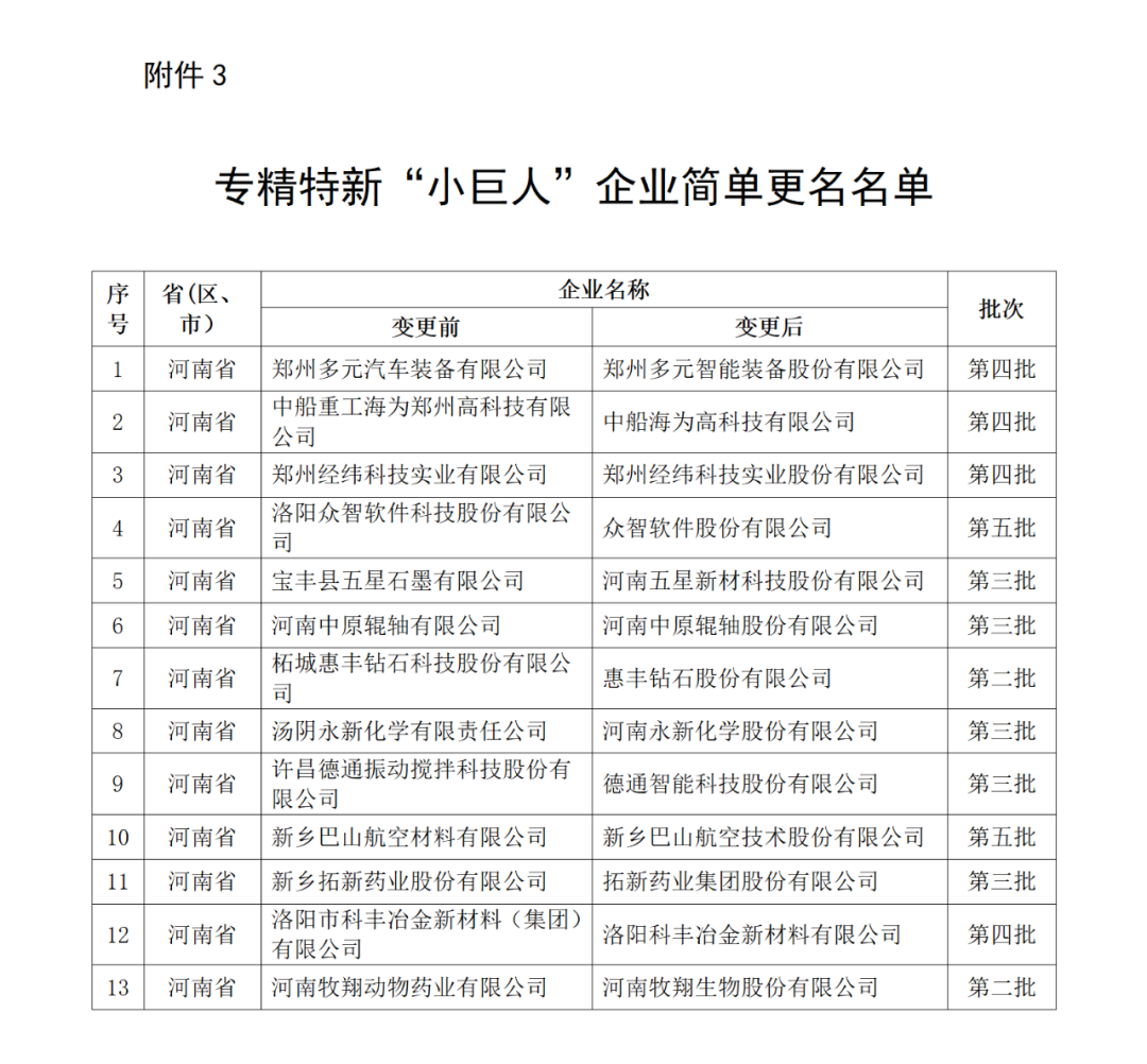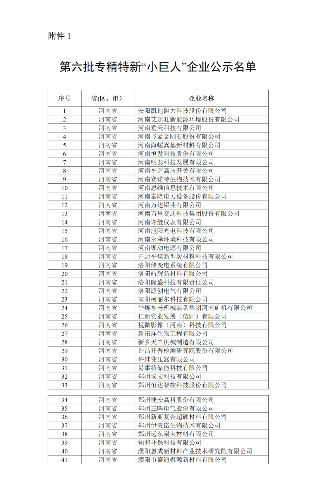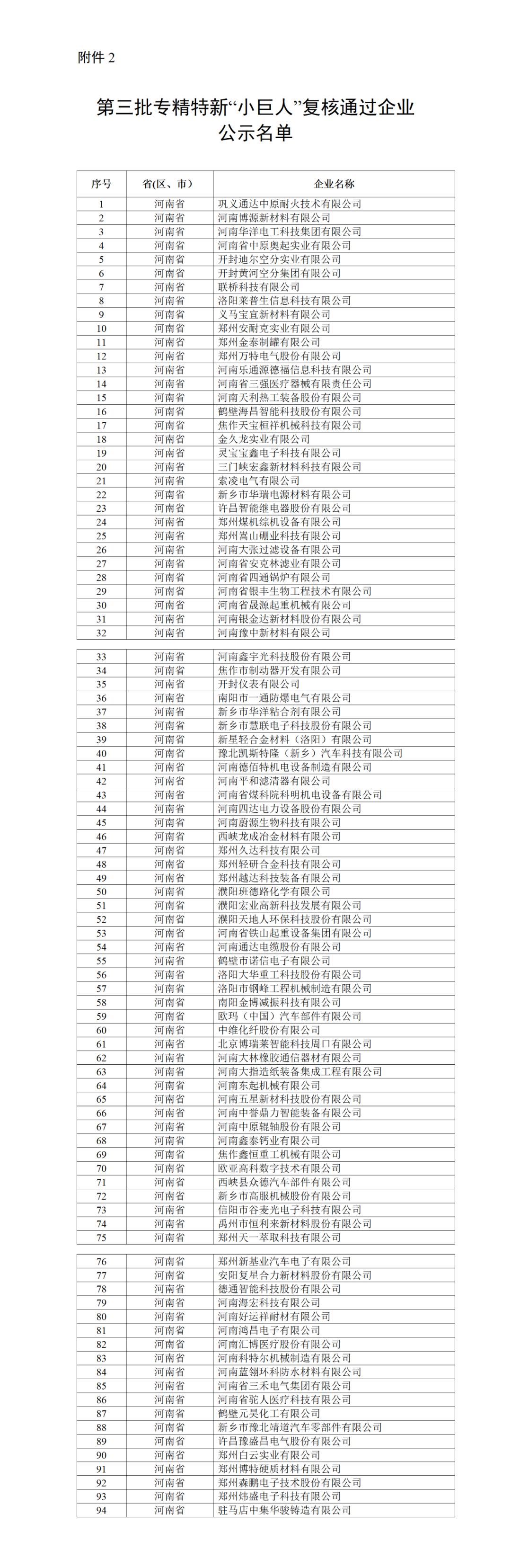 为深入贯彻习近平总书记关于“培育一批‘专精特新’中小企业”的重要指示精神,工业和信息化部开展了第六批专精特新“小巨人”企业培育和第三批专精特新“小巨人”企业复核工作,已完成相关审核,现将我省通过审核的企业名单予以公示(见附件1、2)。此外,有部分已认定的专精特新“小巨人”企业进行了简单更名,一并将经申请并通过审核的简单更名企业名单予以公示(附件3)。
