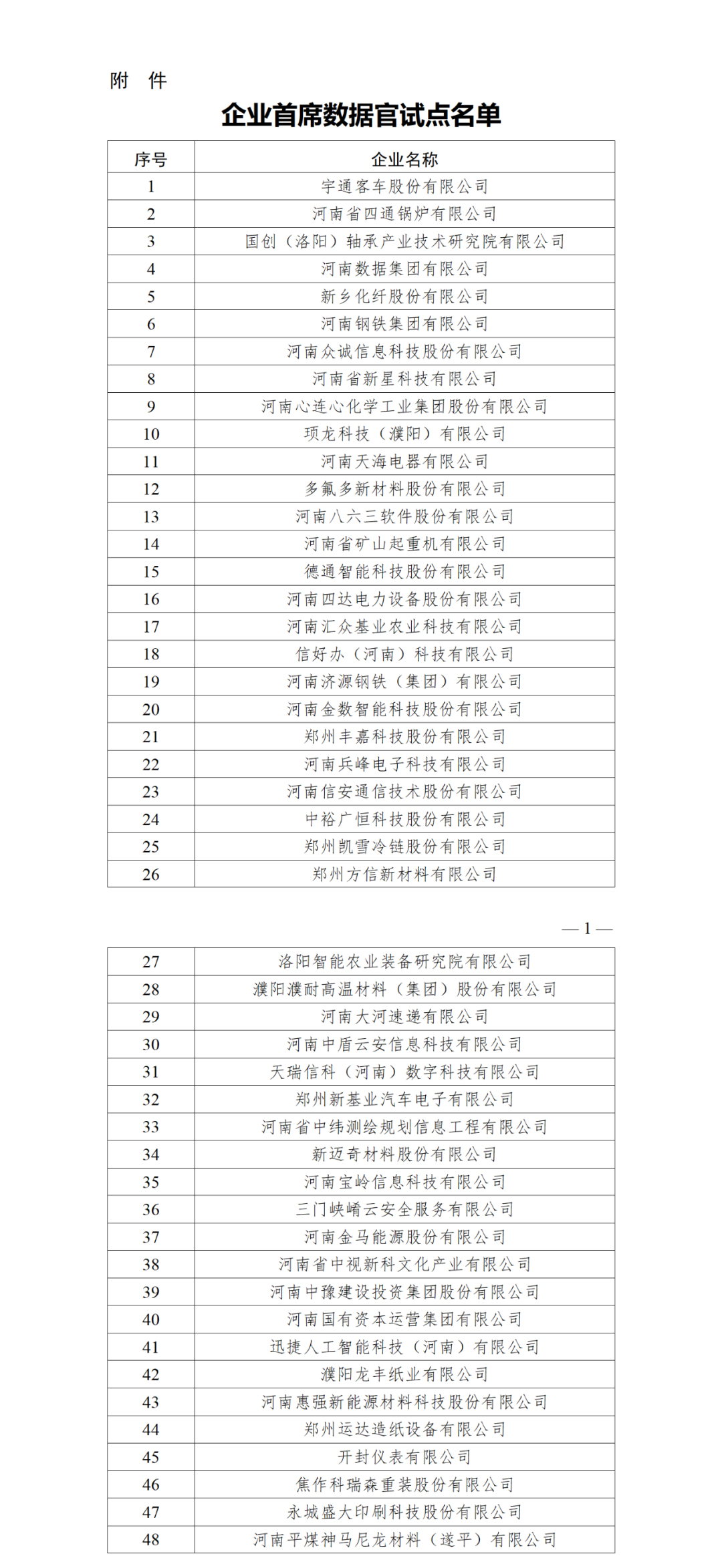 根据《河南省工业和信息化厅办公室关于组织开展企业首席数据官试点申报工作的通知》(豫工信办数据〔2024〕131号),经单位申报、各地审核推荐、专家评审和网上公示,确定宇通客车股份有限公司等48个企业为河南省企业首席数据官试点。现予公布。
