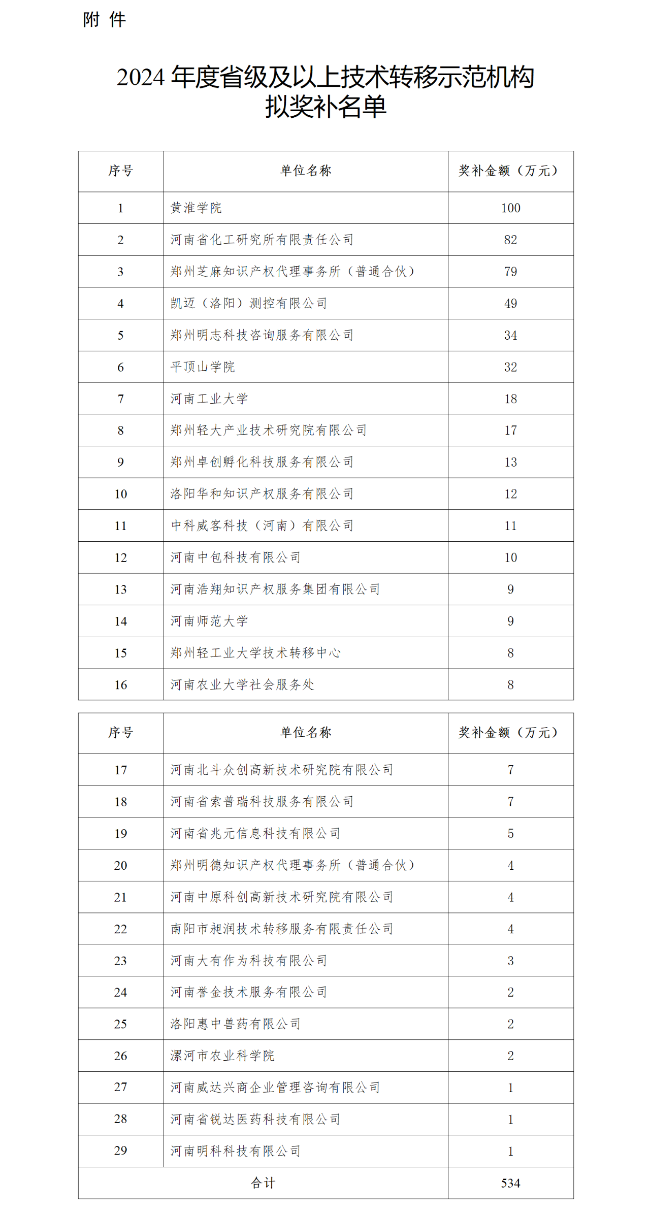 为激发省级及以上技术转移示范机构活力,提升服务效能,按照《河南省人民政府关于印发河南省技术转移体系建设实施方案的通知》(豫政〔2019〕8号)及《河南省科学技术厅 河南省财政厅关于开展2024年度省级及以上技术转移示范机构奖补工作的通知》(豫科〔2024〕57号)有关要求,经专家审核,拟对符合条件及标准的技术转移示范机构实施奖补。现将拟奖补名单予以公示,公示期为5个工作日(2024年9月19日至9月25日)。公示期间,若有异议请向省科技厅实名反映。