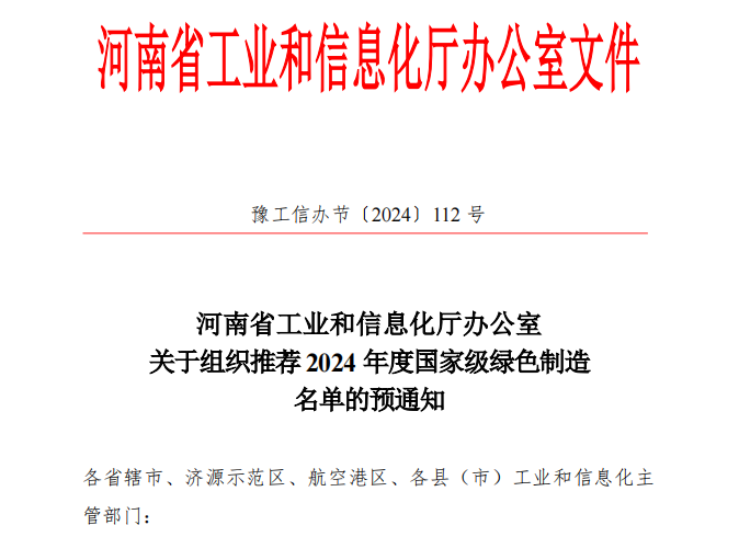 为进一步完善我省绿色制造和服务体系,推动我省工业绿色低碳转型高质量发展,按照工业和信息化部《绿色工厂梯度培育及管理暂行办法》,现将我省2024年度国家级绿色制造名单推荐工作有关事项预通知如下: